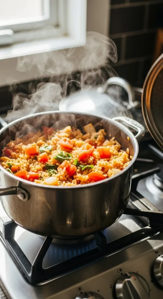 Rice simmers in the same pot, soaking up flavor. The result feels smooth and savory.