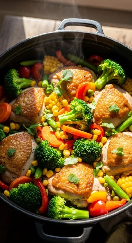 Vegetables cook alongside chicken.