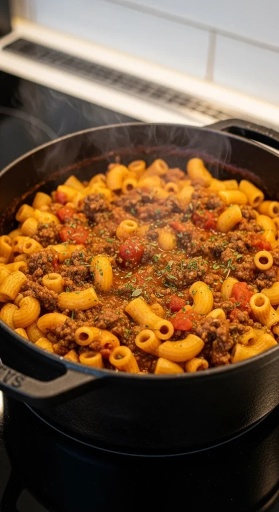 Pasta cooks directly in the meat sauce.