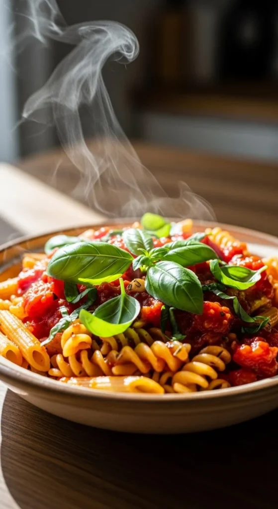 Basil goes in at the end for aroma. The sauce clings naturally to the pasta.