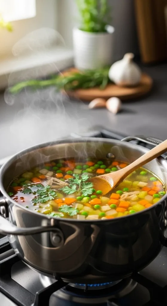 Vegetables soften and create a thick, comforting texture.