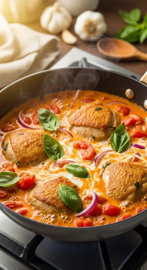 Chicken cooks gently in garlic and butter before liquid is added. As it simmers, the sauce thickens and coats every bite.