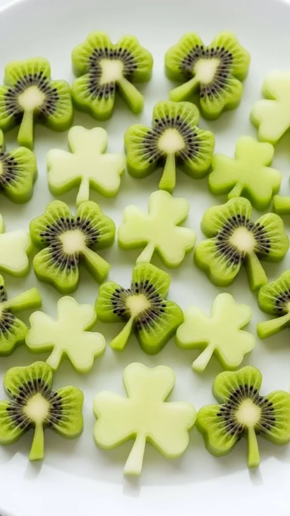 Use green fruits like kiwi or honeydew. Slice and cut shamrock shapes carefully. Pat dry before serving.