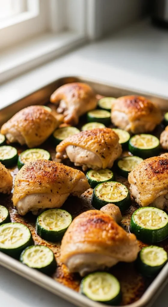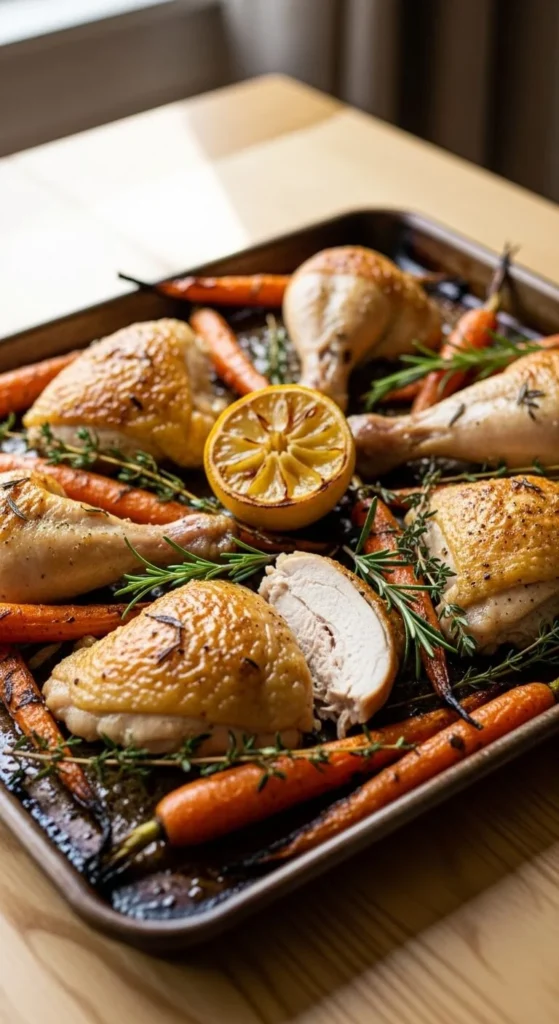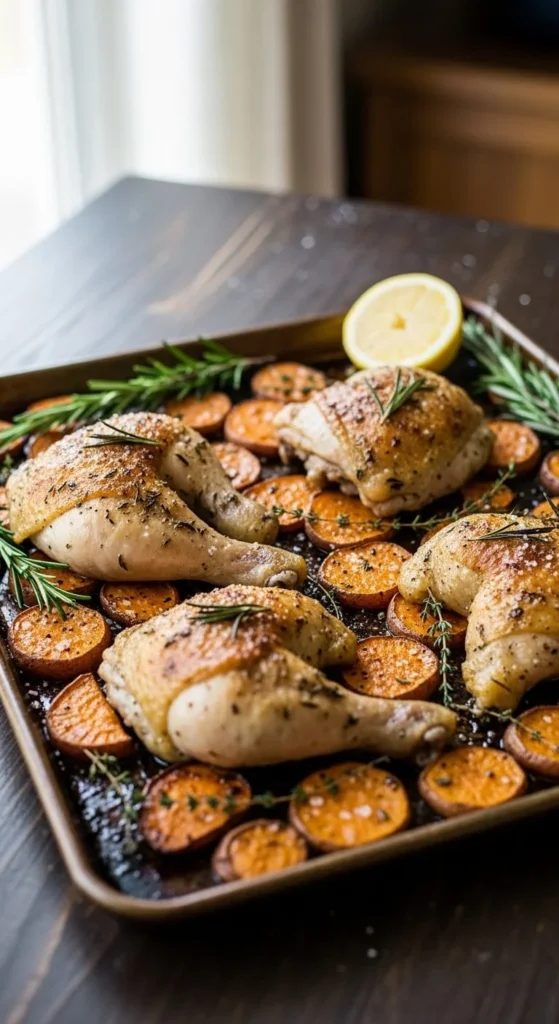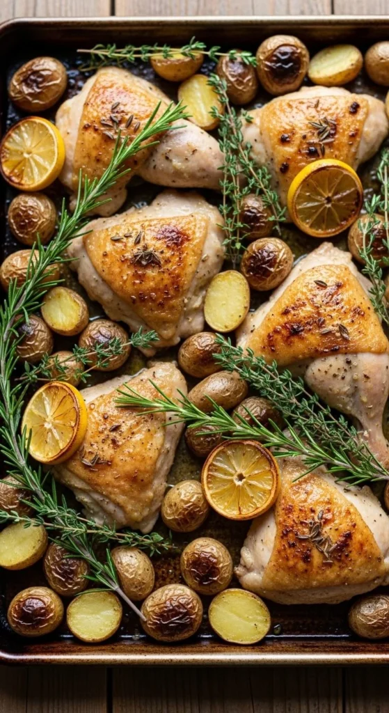 Chicken thighs roast alongside chopped potatoes until golden. Lemon slices add brightness near the end.