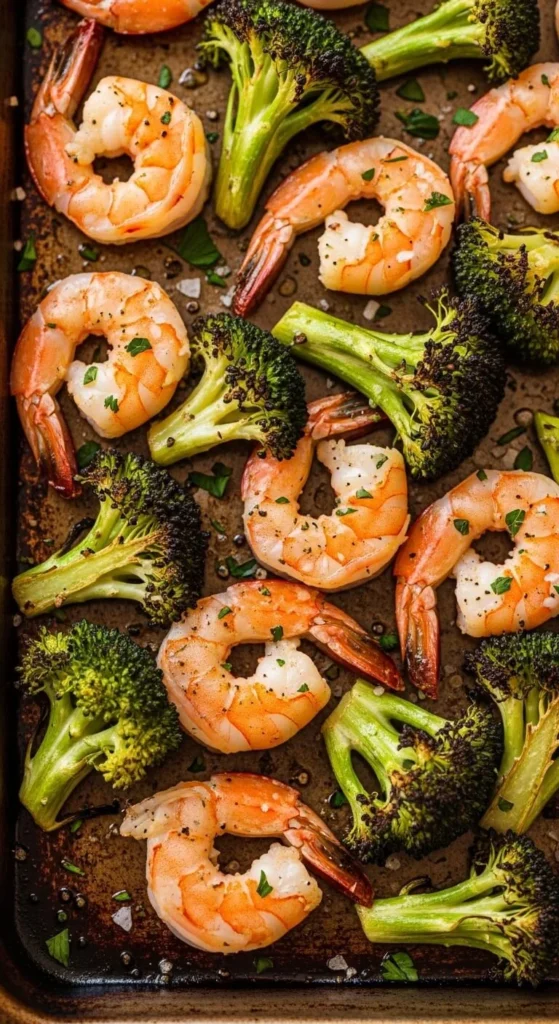 Shrimp cooks fast, so add it after broccoli starts roasting.
