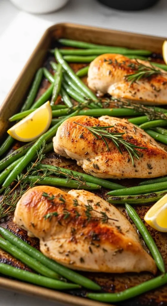 Season chicken simply and spread green beans around it.