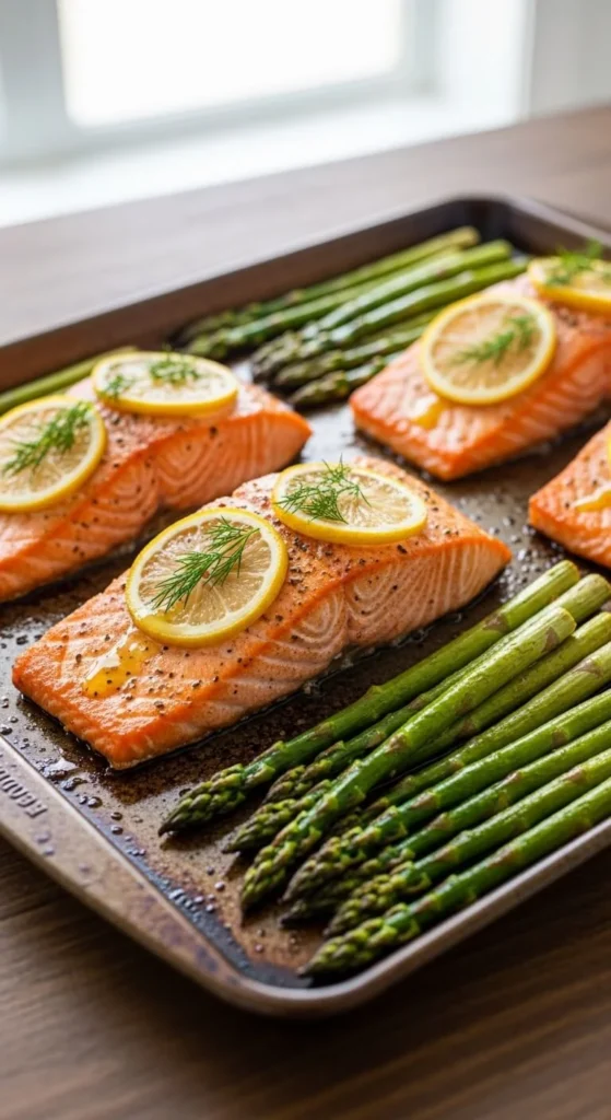 Salmon stays tender while asparagus roasts quickly.