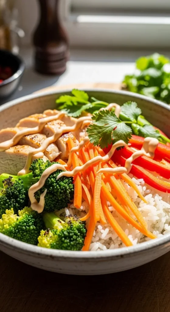 Keep the rice portion modest and load up vegetables. This bowl feels balanced and filling. Use leftovers to save time.