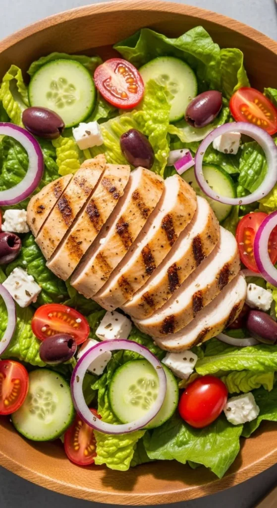 This salad balances protein and crunch without feeling heavy. Cook chicken breast with salt and pepper. Slice thin once cooled. Toss with mixed greens, cucumber, and a simple lemon dressing made from oil and juice. Keep portions generous so the salad satisfies.