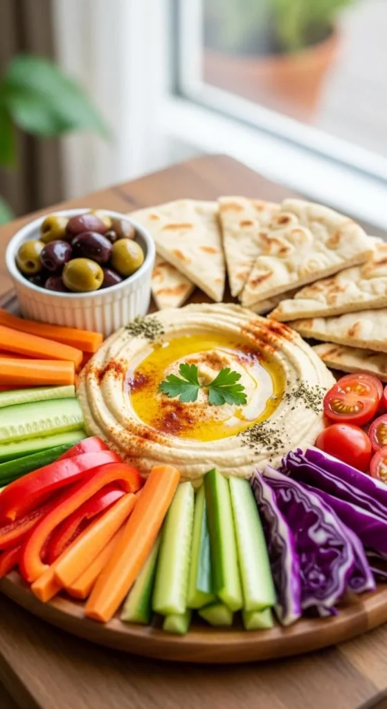 This lunch requires no cooking and feels satisfying. Hummus adds protein and creaminess. Use homemade or store-bought. This plate works well when time is tight.