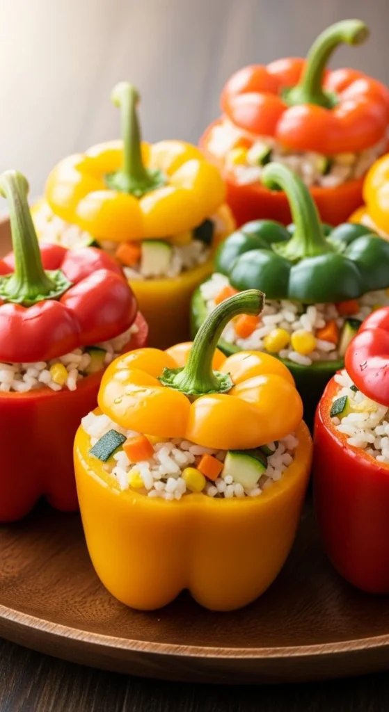 Fill peppers with rice, vegetables, and herbs. Bake until tender.
