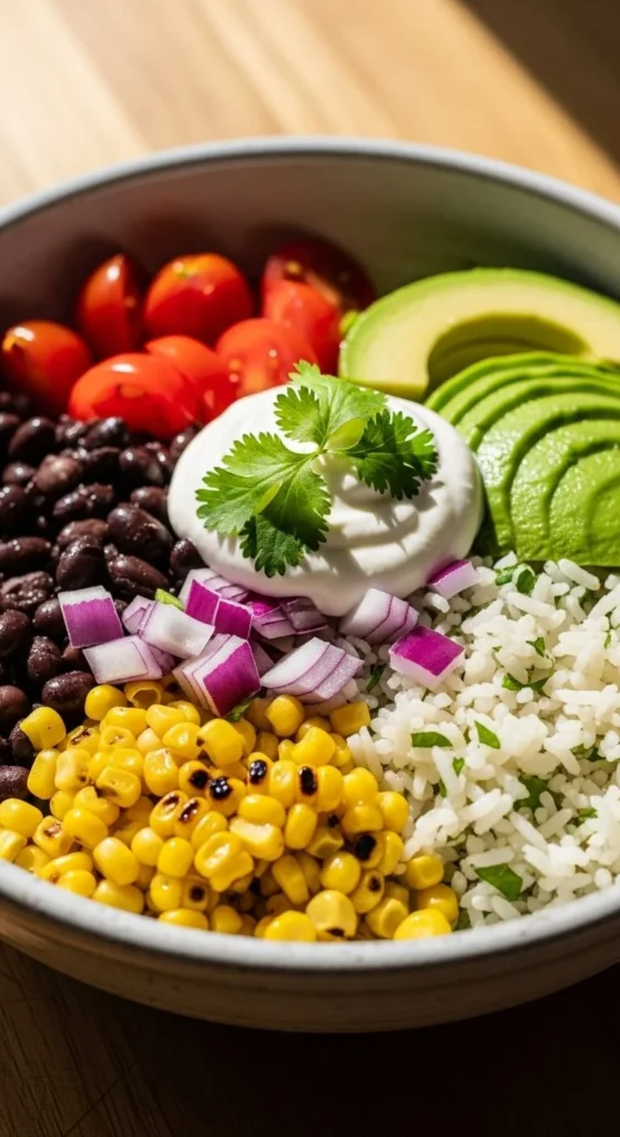 Layer rice, beans, and vegetables in bowls. Add simple toppings.