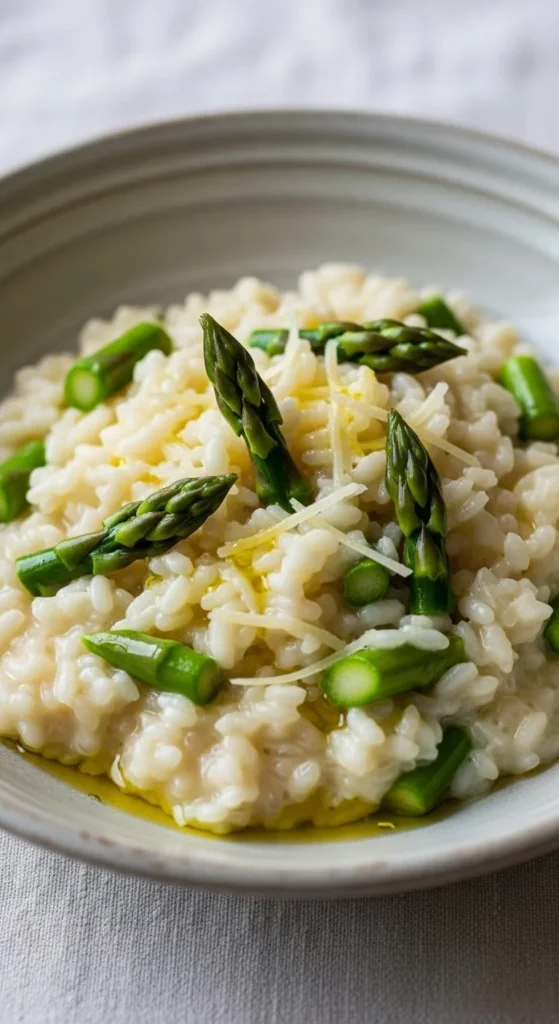 Risotto feels special without complex steps. Stir rice slowly with warm broth. Add asparagus near the end so it stays tender.
