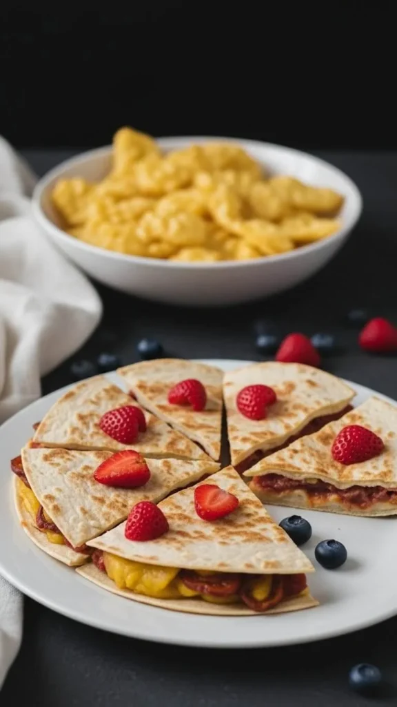 Fill tortillas with eggs and cheese. Cook until crisp outside and melty inside. Slice into wedges.