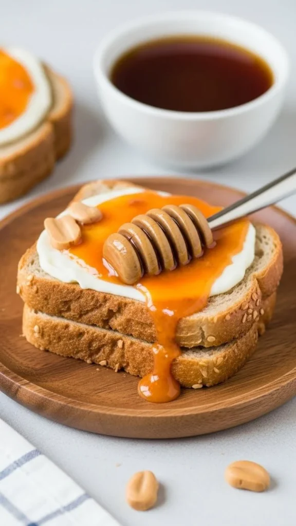 Spread peanut butter thick on warm toast. Drizzle honey over the top. Cut into halves.