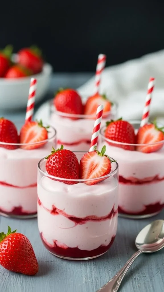 Parfait cups feel light but still comforting. Use clear glasses or small jars. Layer yogurt, chopped strawberries, and granola. Repeat the layers so the colors show through the glass.