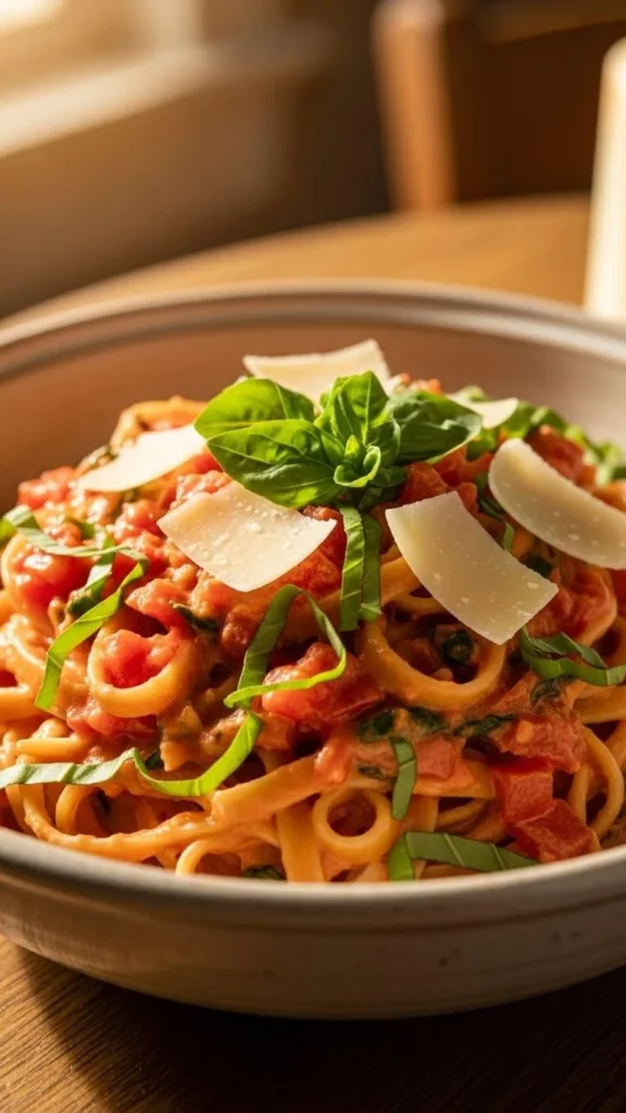 This pasta feels comforting and light. Canned tomatoes work well. Add cream at the end. Fresh basil adds aroma. Serve hot and simple.