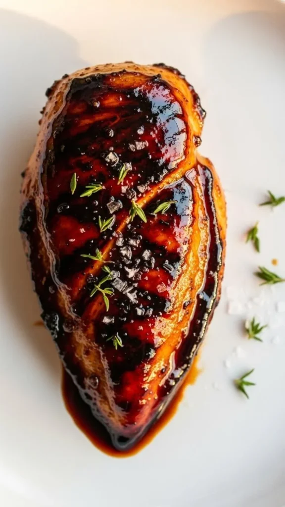 Balsamic reduction adds sweetness and depth. Use a simple pan sauce. Serve with potatoes or rice. Plate with glaze drizzled lightly.