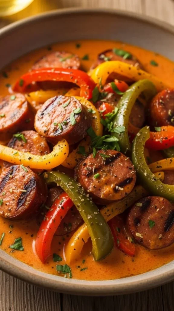 Sausage brings bold flavor. Peppers add sweetness. Serve with pasta or bread. Keep the plate clean and centered.