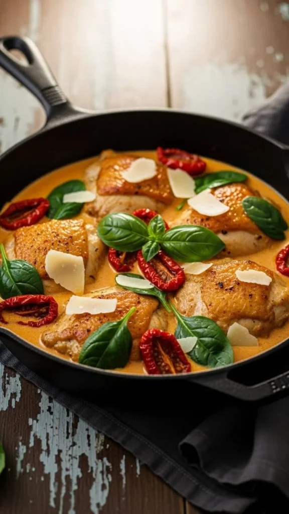 This dish looks complex but cooks fast. Chicken breasts simmer in a creamy sauce with garlic and tomatoes. Spinach wilts right at the end. Serve with rice, pasta, or bread. One skillet keeps it stress-free. Use pantry ingredients to save money. The sauce feels rich without extra steps. Plate with sauce spooned generously over the chicken. Keep portions neat and centered.