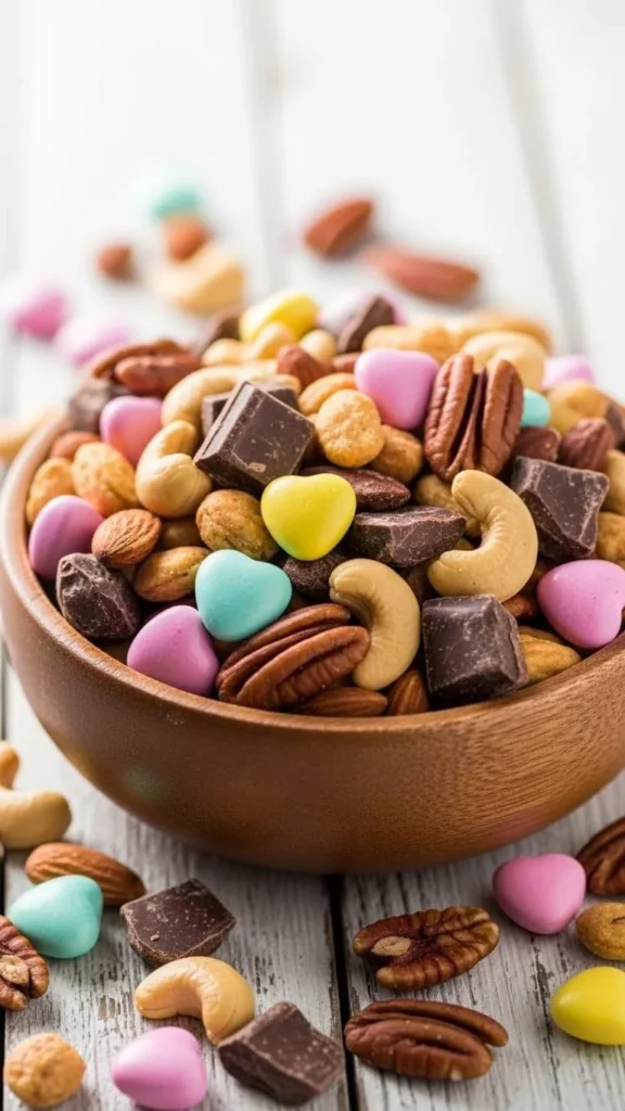 Mix cereal, nuts, and small chocolates. Add candy hearts for color.