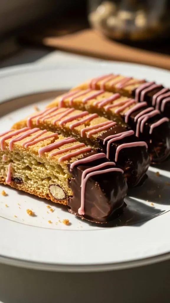 Bake biscotti dough and slice. Bake again until crisp. Dip one end in chocolate.