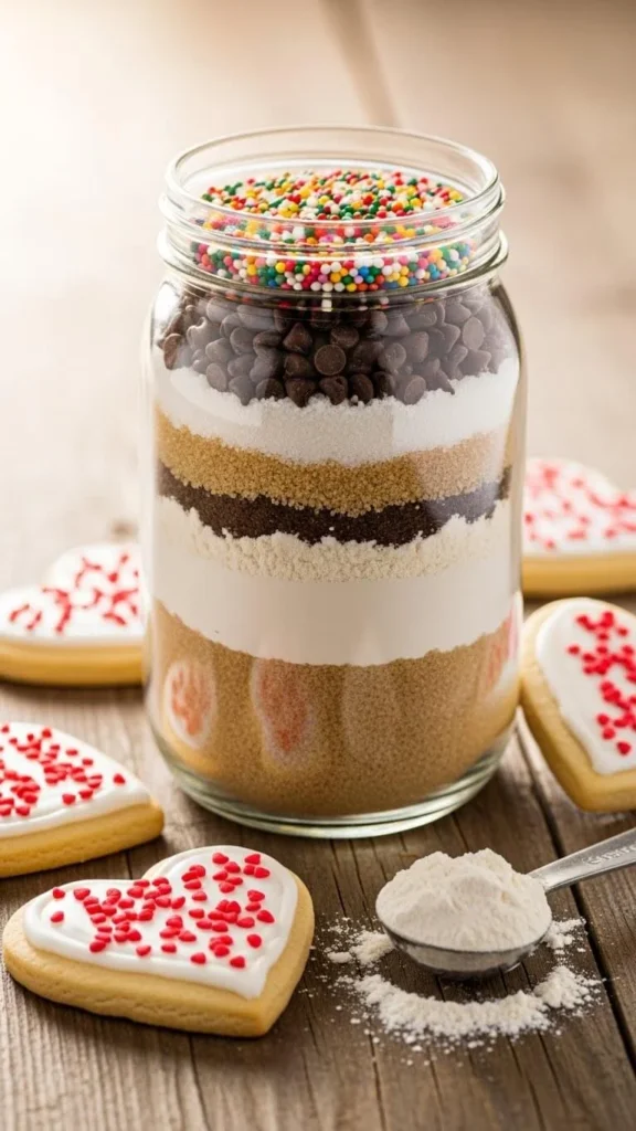 Layer dry cookie ingredients in a clear jar. Flour, sugar, and sprinkles look nice stacked. Attach a small tag with baking instructions.