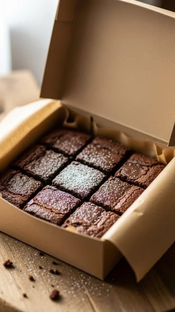 Line small boxes with parchment. Add two or three brownies per box. Dust lightly with powdered sugar if you like.